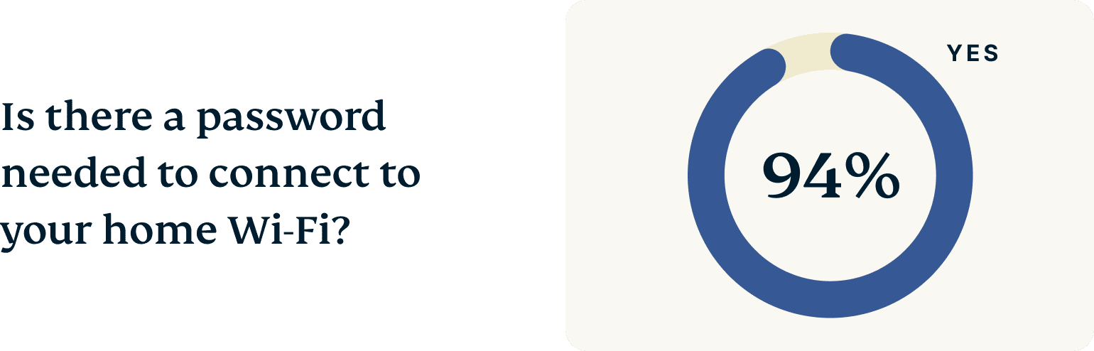 Our survey results reveal that a significant majority (94%) of respondents use passwords to protect their home Wi-Fi networks, which aligns with the common practice of setting up passwords during router installation. Furthermore, 38% of respondents admit to updating their passwords regularly. While this practice isn't necessary if you have a strong password saved in a password manager, it can prevent past Wi-Fi users from retaining access.