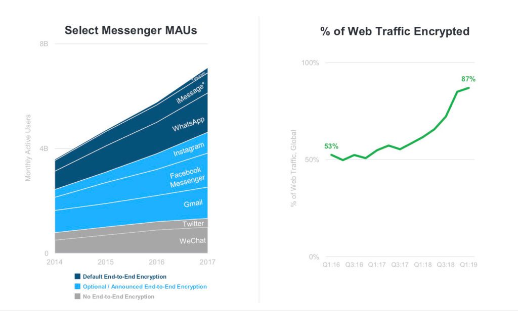 The past few years have seen a steady increase in the number of monthly active users of encrypted messaging services. The most significant increase comes from the increase in encrypted web traffic, which has jumped from 53% in 2016 to 87%(!) in 2019.