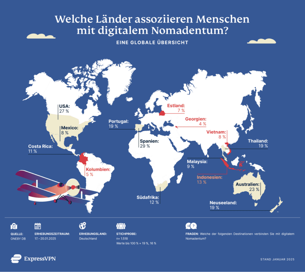 Die Wahl des nächsten temporären Standorts hängt von weit mehr ab als nur von schönen Landschaften. An die Sicherheit der Online-Aktivitäten muss auch gedacht werden. Ein VPN (Virtual Private Network) ist erforderlich, um die Privatsphäre zu wahren und die Online-Aktivitäten zu schützen, insbesondere wenn in öffentlichen Netzwerken gearbeitet wird, aber auch um weiterhin auf heimische Dienste zugreifen zu können. Hier haben wir weitere Information zum Thema "Was ist ein VPN" zusammengefasst.