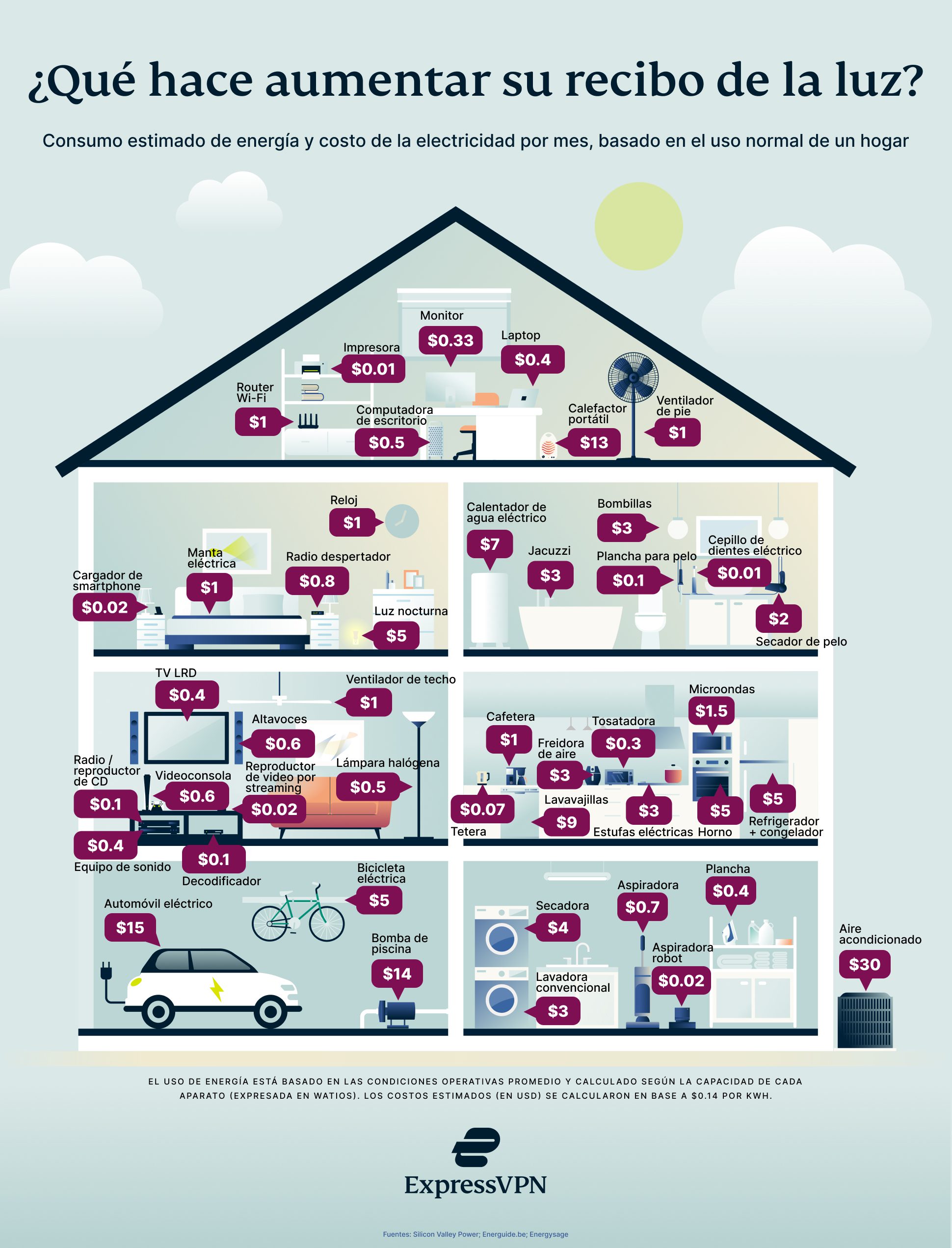 *La energía consumida por equipos tecnológicos domésticos, según las condiciones de operación promedio, se calcula según su capacidad (expresada en watts) por hora y después por mes. Los costos estimados están basados en 0,14 USD por kWh, que es el promedio nacional de los EE. UU. La frecuencia y uso individual pueden variar.
