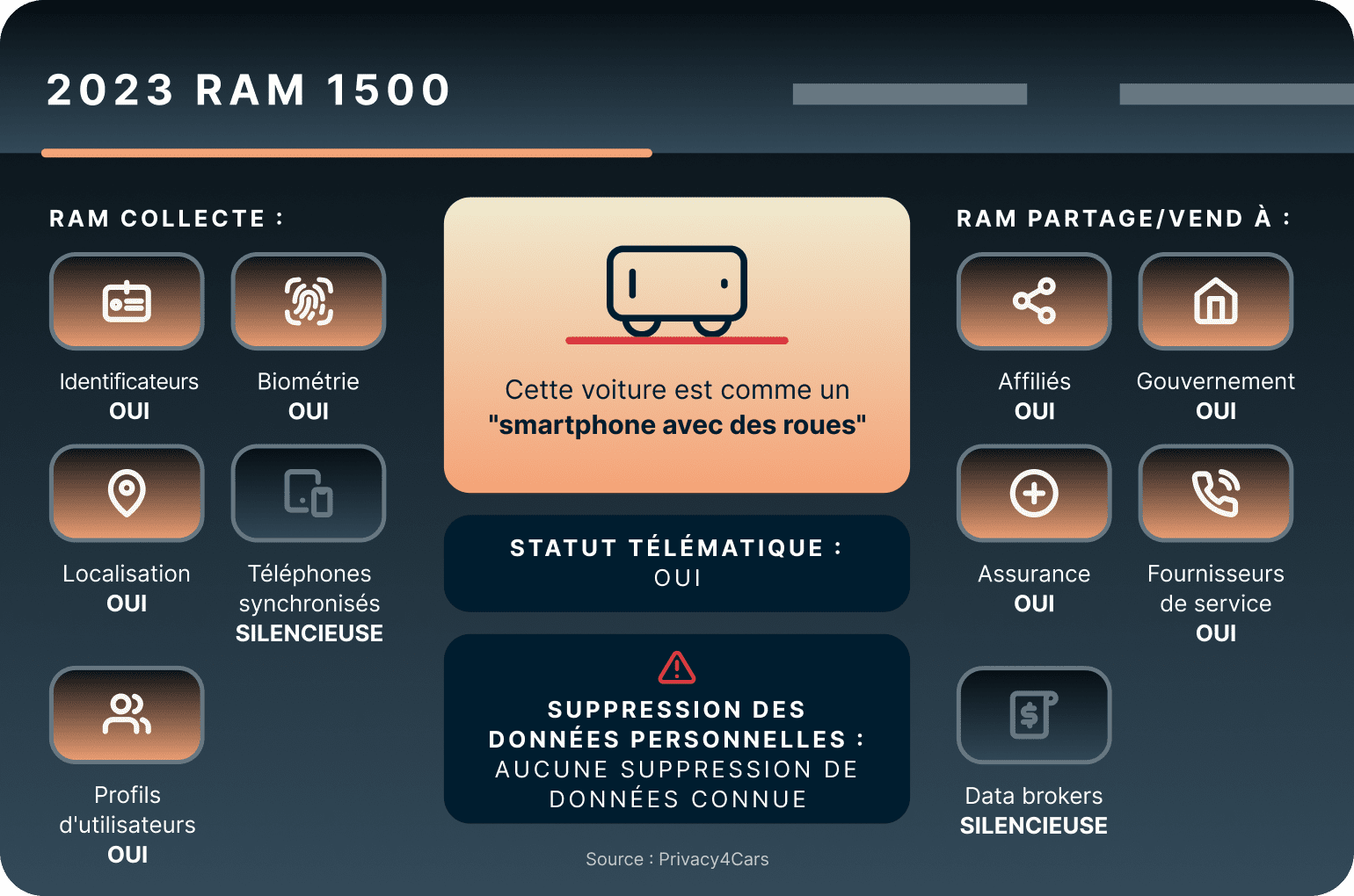 Lorsqu’il s’agit des données personnelles, RAM opte pour une politique “sans suppression”, incluant les identifiants personnels allant des noms et des adresses aux numéros de sécurité sociale et aux informations sur le permis de conduire, ainsi que les données biométriques. RAM surveille également les habitudes de conduite, enregistrant les horodatages, la vitesse, l’accélération et le freinage. Le véhicule suit les détails de trajet comme la localisation, la météo et les routes empruntées. Il garde même un œil sur son propre statut, surveillant le niveau d’essence, les niveaux de batterie et l’imagerie par caméra.