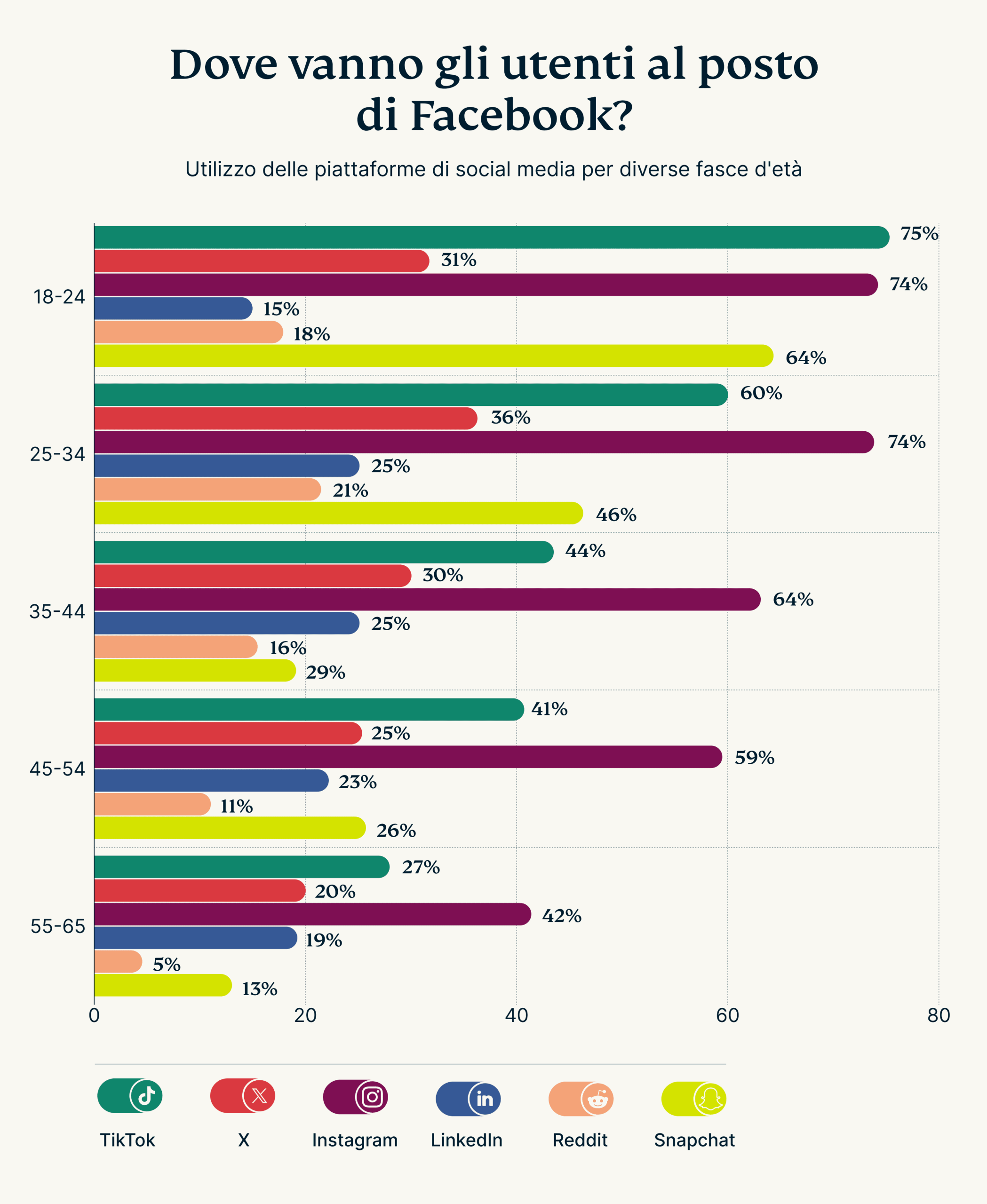 Per la Gen Z (18-24 anni), piattaforme come TikTok e Instagram sono ormai al centro della scena. TikTok domina con il 75% degli utenti Gen Z, mentre Instagram è subito dietro con il 74%. Anche Snapchat rimane popolare, utilizzato dal 64% di questo gruppo per interazioni rapide e informali.