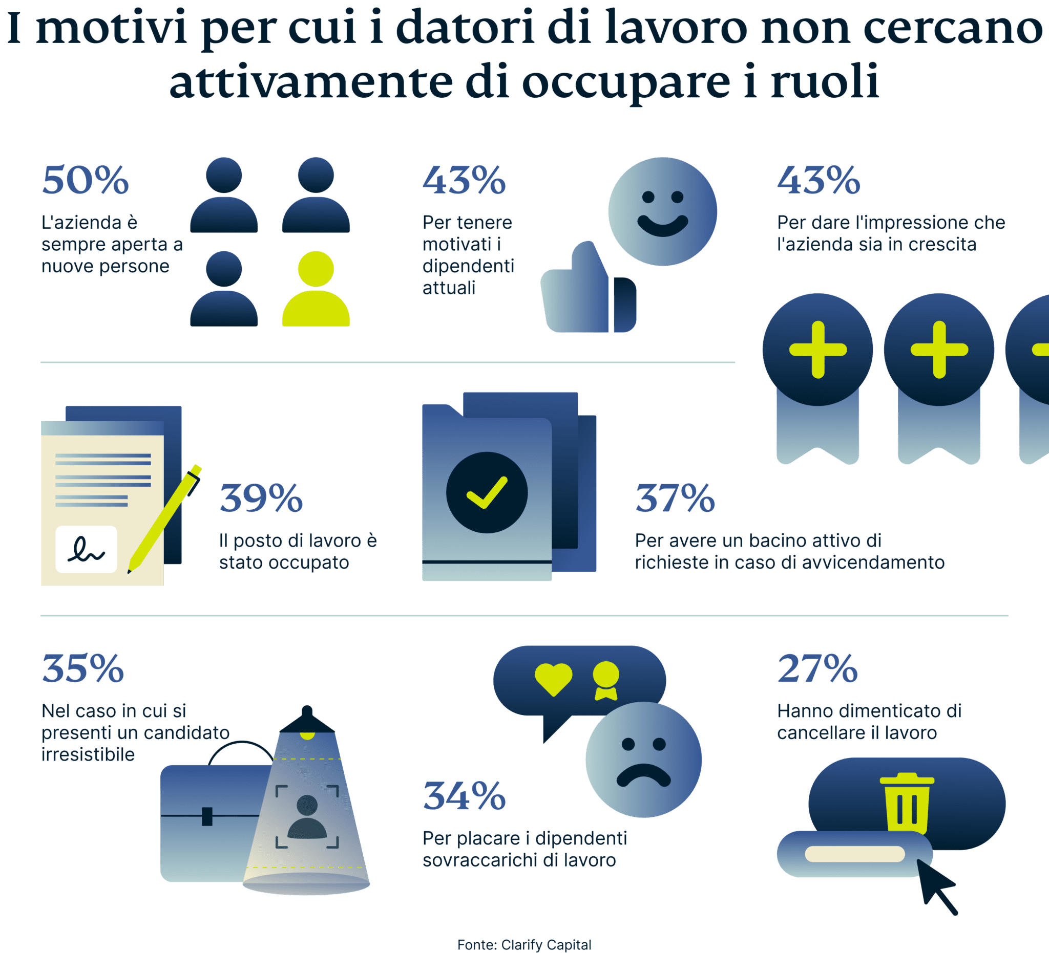 - Uno studio condotto da Clarify Capital ha rilevato che, se da un lato molti datori di lavoro tengono elencate le offerte di lavoro fantasma solo nel caso in cui un buon candidato faccia domanda, dall'altro il 43% di coloro che pubblicano offerte di lavoro fantasma lo fanno per dare l'impressione che l'azienda stia crescendo.