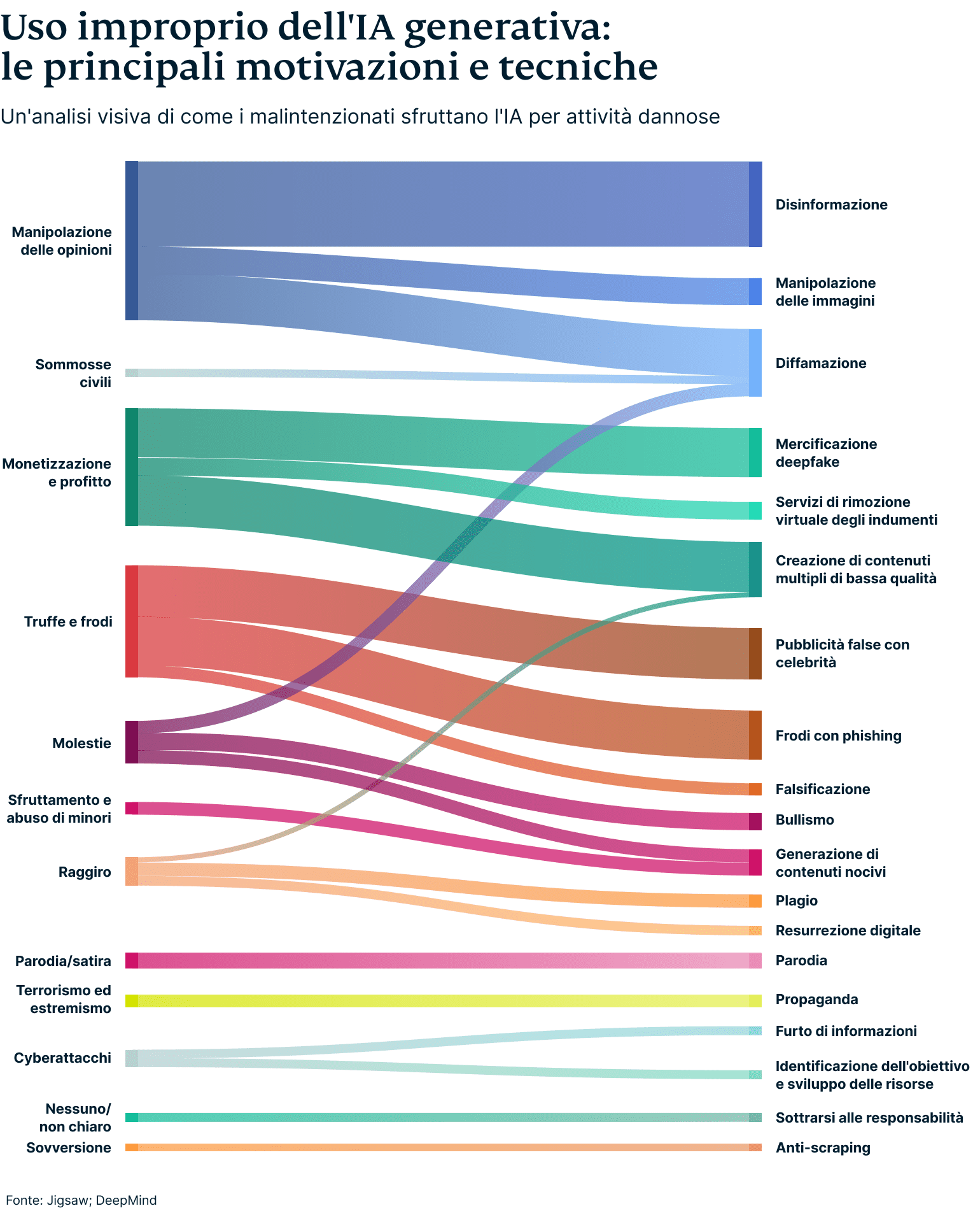Un recente studio di Google DeepMind ha rilevato che influenzare l'opinione pubblica è l'obiettivo malevolo più comune dell'uso dell'IA generativa, soprattutto attraverso i deepfake multimediali. La creazione di immagini, video e audio realistici ma falsi di persone è stata quasi due volte più comune rispetto al successivo uso improprio degli strumenti di IA generativa, ovvero la creazione di contenuti online di disinformazione basati sul testo.