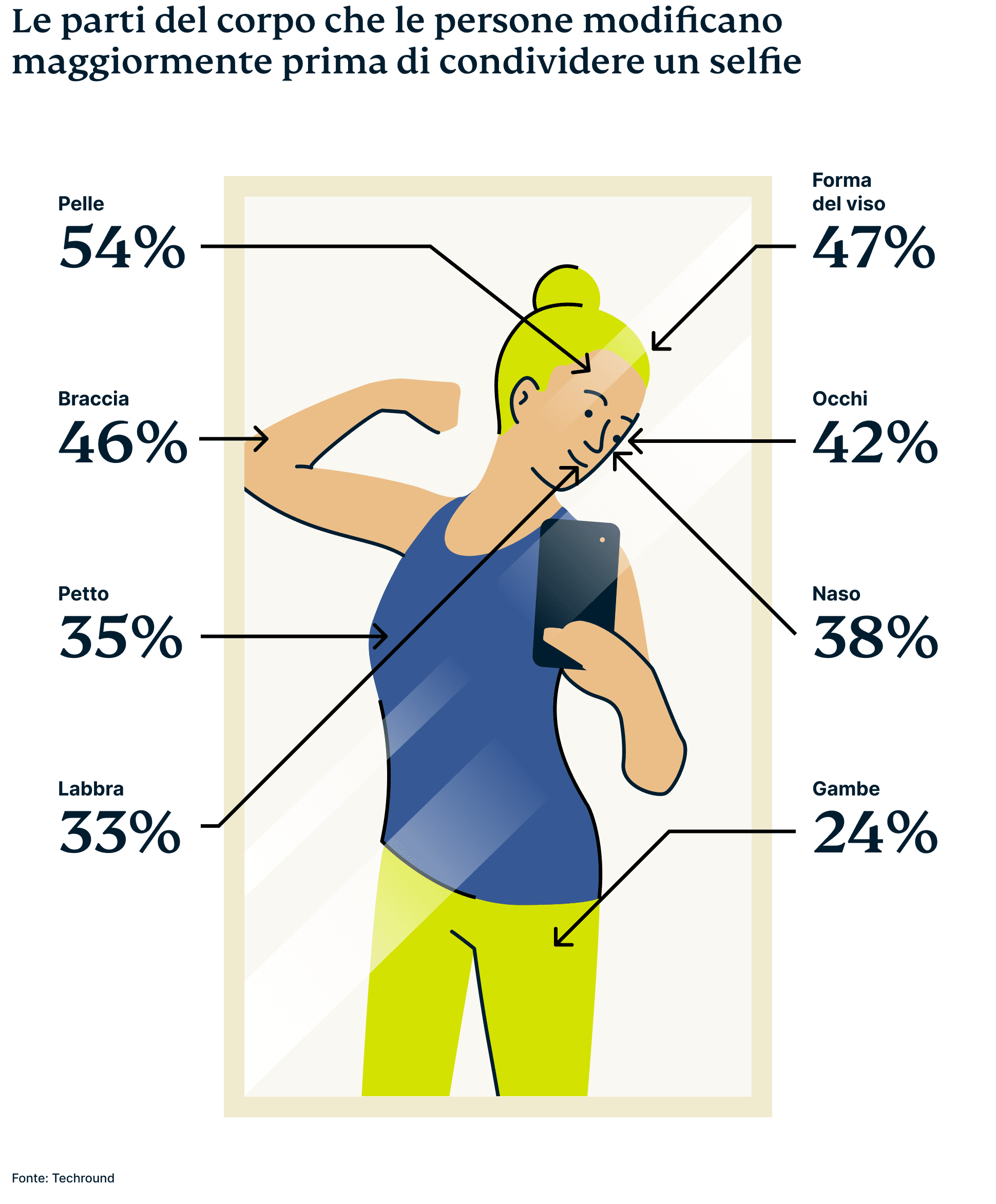 Tra le persone che modificano i propri selfie, circa l'8% usa Instagram per farlo, mentre due terzi utilizzano l'app Facetune. In questo modo si assicurano di nascondere le imperfezioni della pelle e di alterare i tratti del viso.