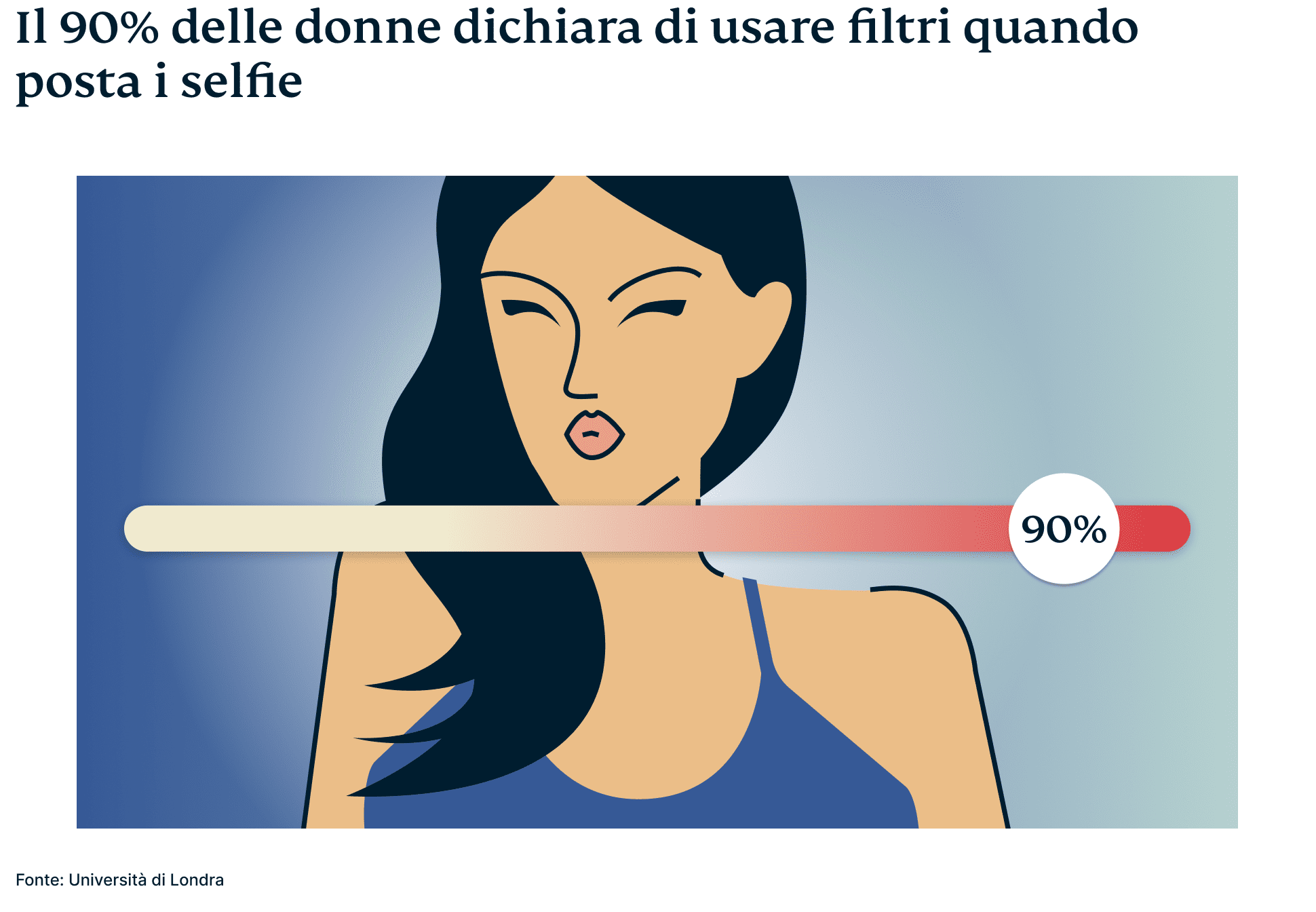 Anche i filtri svolgono un ruolo rilevante nel plasmare il proprio aspetto online. Sia gli uomini che le donne hanno ammesso di utilizzare occasionalmente dei filtri per migliorare la propria immagine. Tuttavia, le donne risultano essere quelle che ne fanno un uso più frequente, visto che 9 su 10 hanno ammesso di utilizzare i filtri quando pubblicano selfie sui social media.