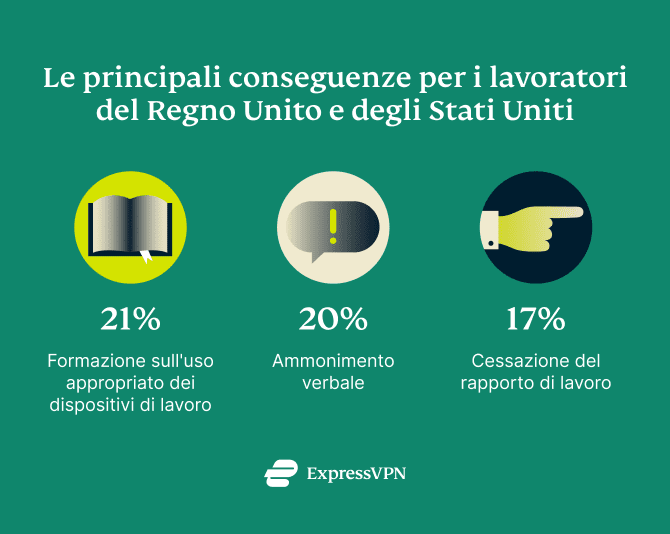 Il 21% degli intervistati ha dichiarato che il principale provvedimento che ha subito per l'utilizzo dei dispositivi aziendali per scopi diversi da quelli lavorativi è stato quello di dover seguire corsi di formazione su come utilizzare correttamente i dispositivi di lavoro. Inoltre, il 20% ha riferito di aver ricevuto un richiamo verbale e il 17% ha dichiarato di esser stato licenziato.