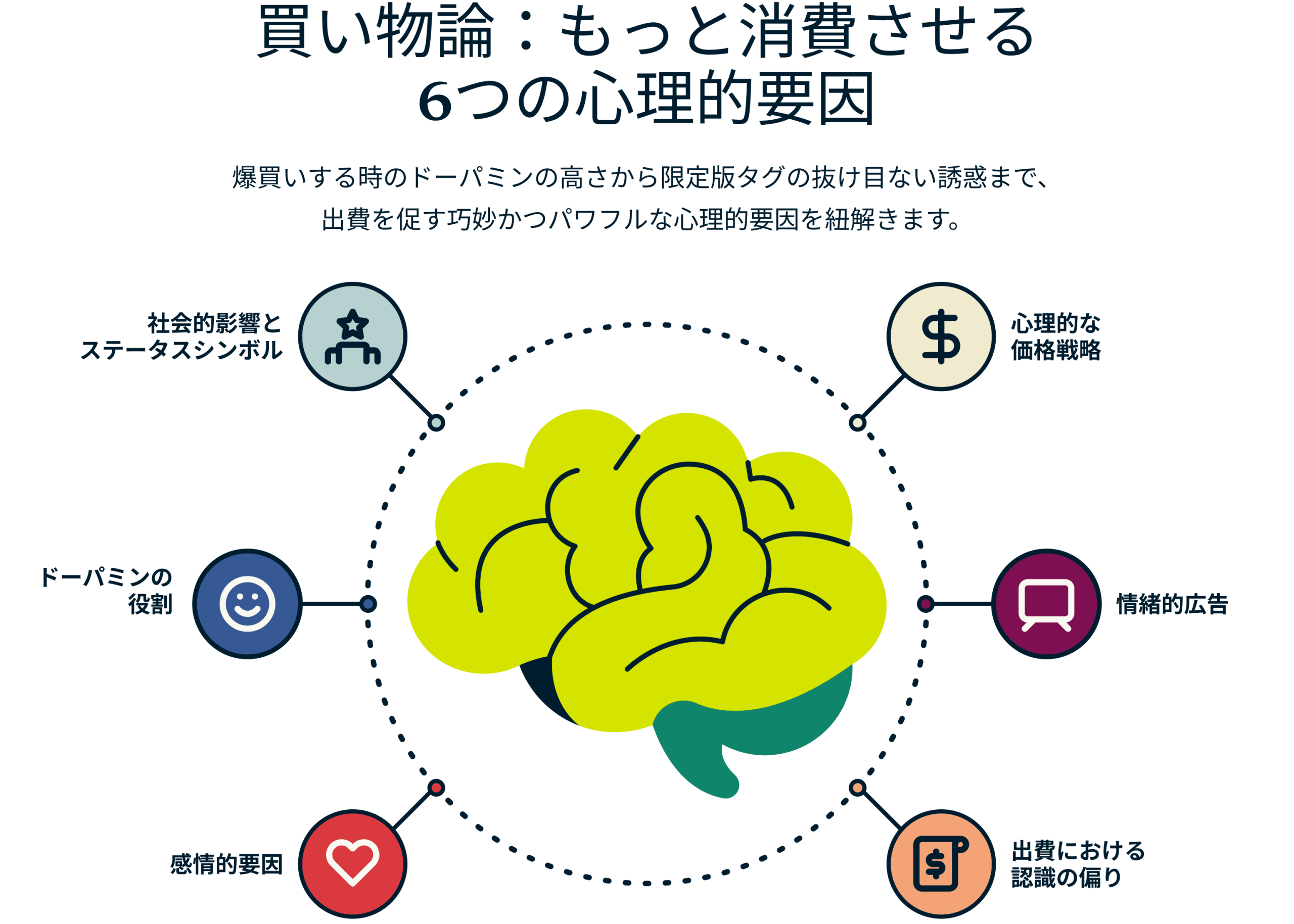 • ドーパミンの役割:喜びに関連する神経伝達物質のドーパミンは、買い物中に放出され、常に分泌された状態にになり、衝動的買いにつながることがよくあります。この「気分が良くなる」要因は、無計画の購入の強い要因です。