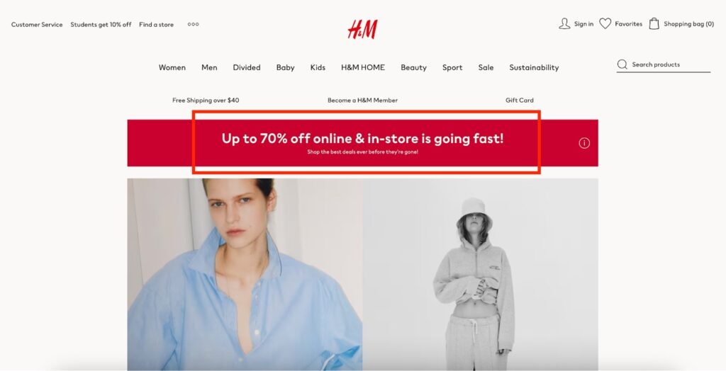これは期間限定セールイベントで、切迫性を作り出して顧客がすばやく購入するように促します。ASOS、Shein、H&Mなどのファストファッションウェブサイトは、フラッシュセールに特化していて、期間限定で製品やサービスでお買い得品を提供しています。