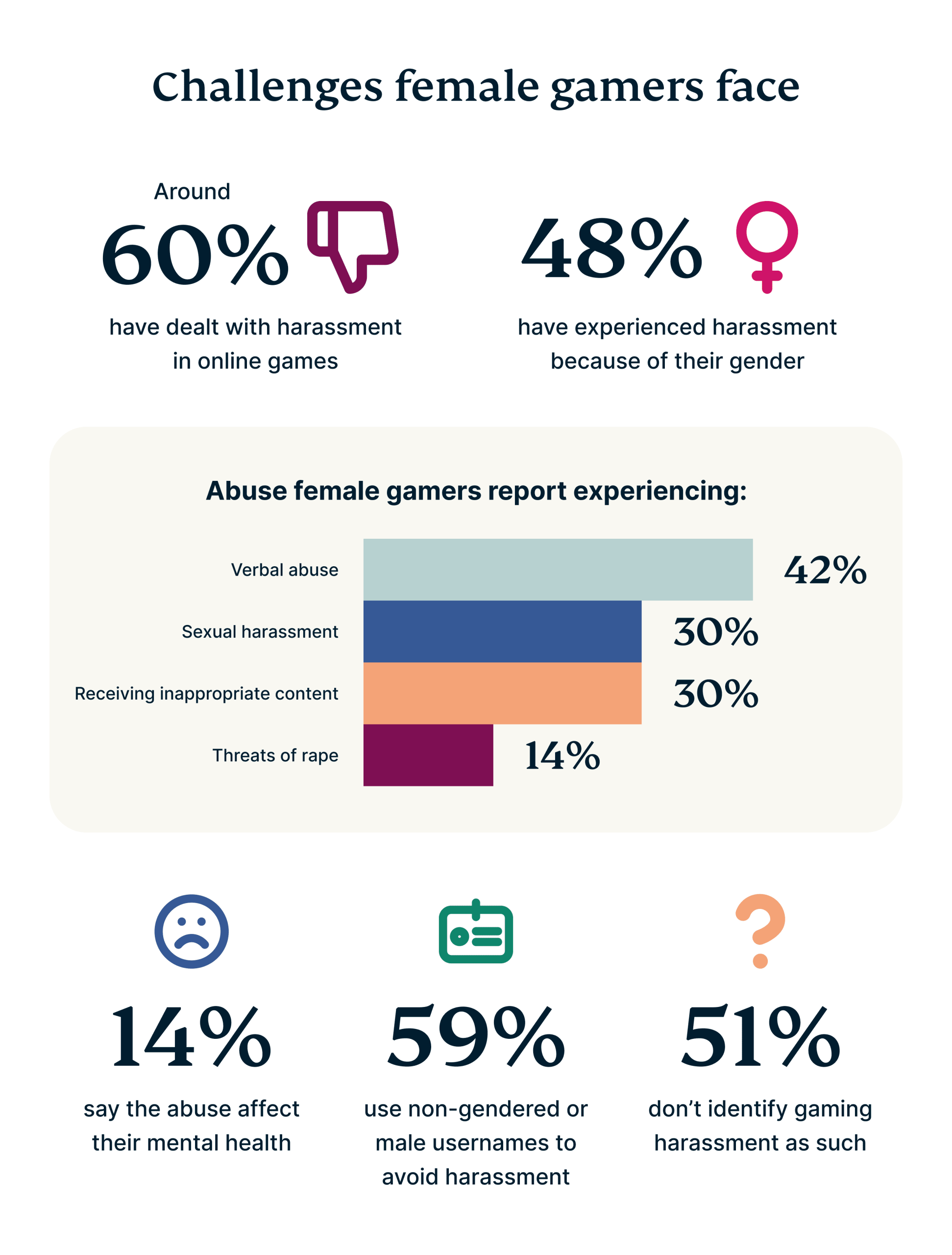 이러한 적대감은 실제 결과를 초래합니다. 많은 여성 게이머들은 타겟이 되지 않기 위해 정체성을 숨겨야 한다는 압박감을 느낍니다. IntentaDigital에 따르면 여성의 59%가 괴롭힘을 피하기 위해 비성별 또는 남성 사용자명을 사용합니다. 거의 3분의 2의 여성 플레이어들이 다른 사람인 척하는 것이 더 안전하다고 느끼고 있는 것은 문제가 깊다는 것을 의미합니다.