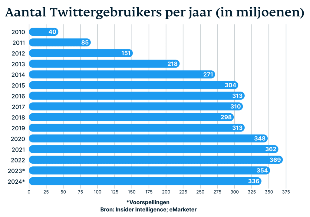 Afbeelding: Twitter is van 2019 tot 2022 elk jaar gestaag gegroeid, met een piek in de cijfers nadat Elon Musk het bedrijf in oktober 2022 had overgenomen. Er wordt echter voorspeld dat het platform tegen eind 2023 4% van de gebruikers zal verliezen, en nog eens 5% tegen 2024.