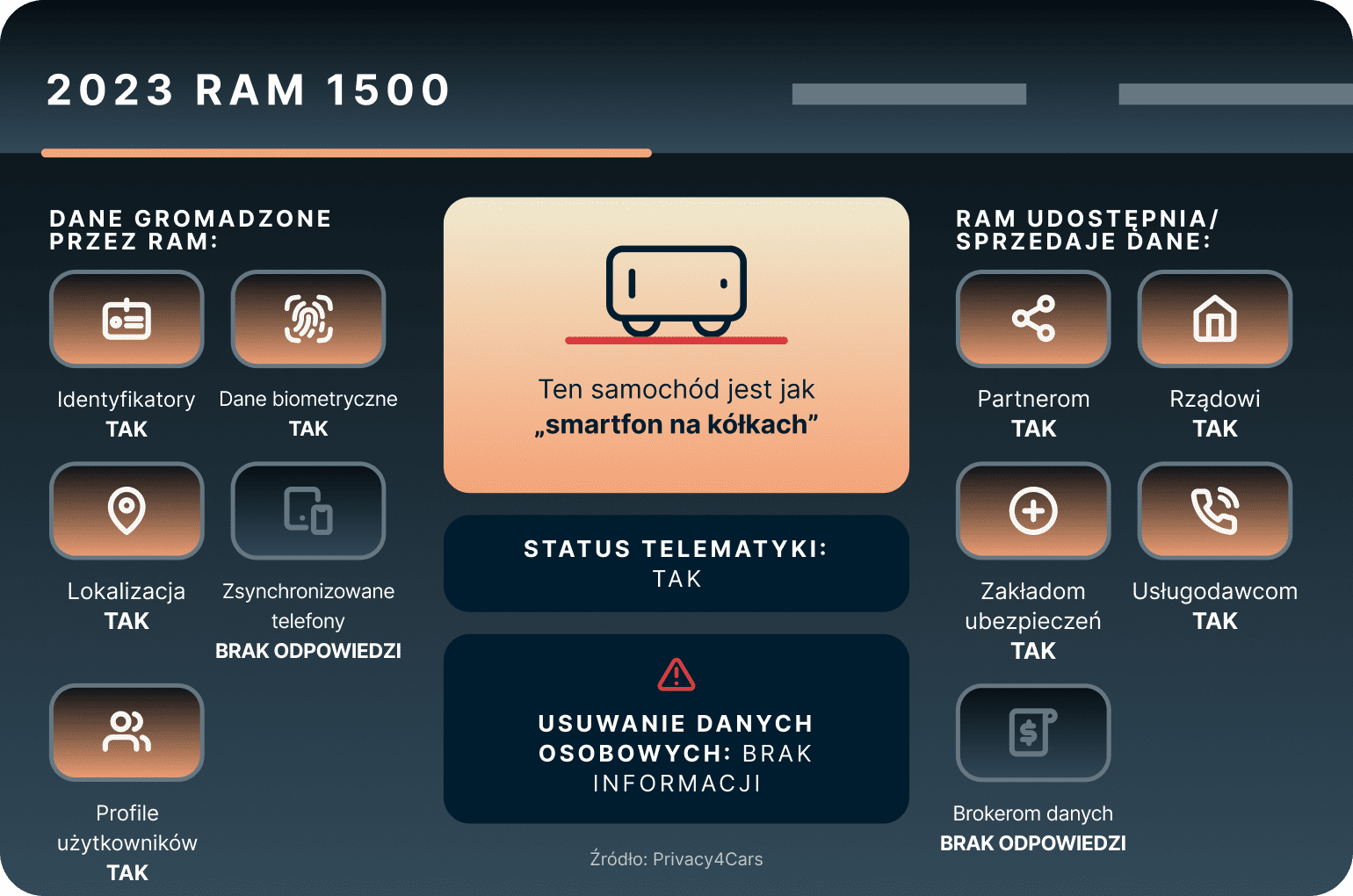 - Privacy4Cars, amerykańska firma motoryzacyjna, na początku tego roku wprowadziła narzędzie o nazwie „Vehicle Privacy Report” (ang. „Raport dotyczący prywatności pojazdu”), aby informować kierowców o zakresie gromadzenia danych przez ich pojazdy.