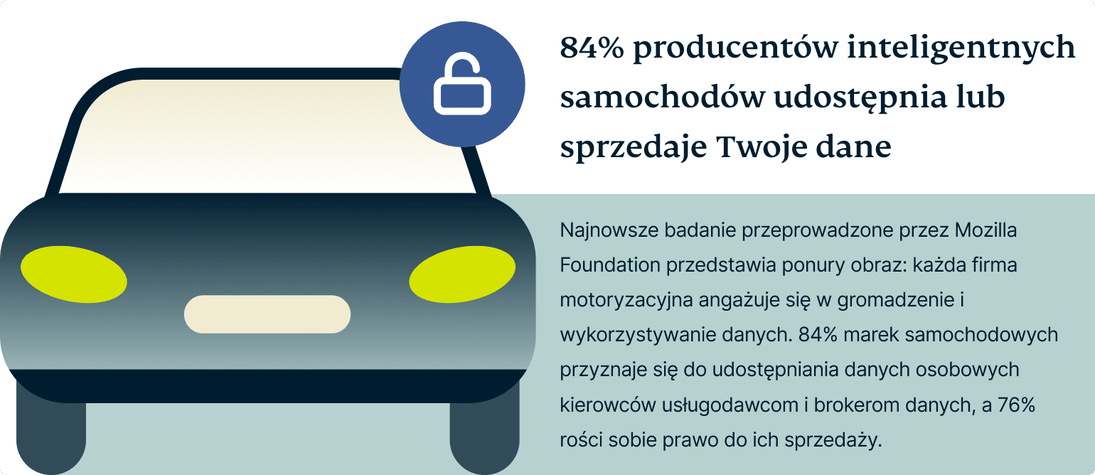 - Najnowsze badania wskazują, że niemal każdy producent samochodów gromadzi informacje na temat kierowców, a aż 84% z nich udostępnia lub sprzedaje te dane.