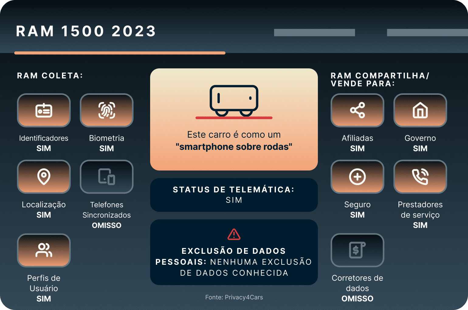 Quando se trata de dados pessoais, a RAM adota uma política de "não exclusão", incluindo identificadores pessoais, desde nomes e endereços até números de Segurança Social e detalhes da carteira de motorista, bem como biometria. A RAM também monitora hábitos de direção, registrando horários, velocidade, aceleração e frenagem. O veículo rastreia detalhes da jornada como localização, clima e rotas tomadas. Ele até mantém um olho em seu próprio estado, monitorando reabastecimento, níveis de bateria e imagens de câmera.