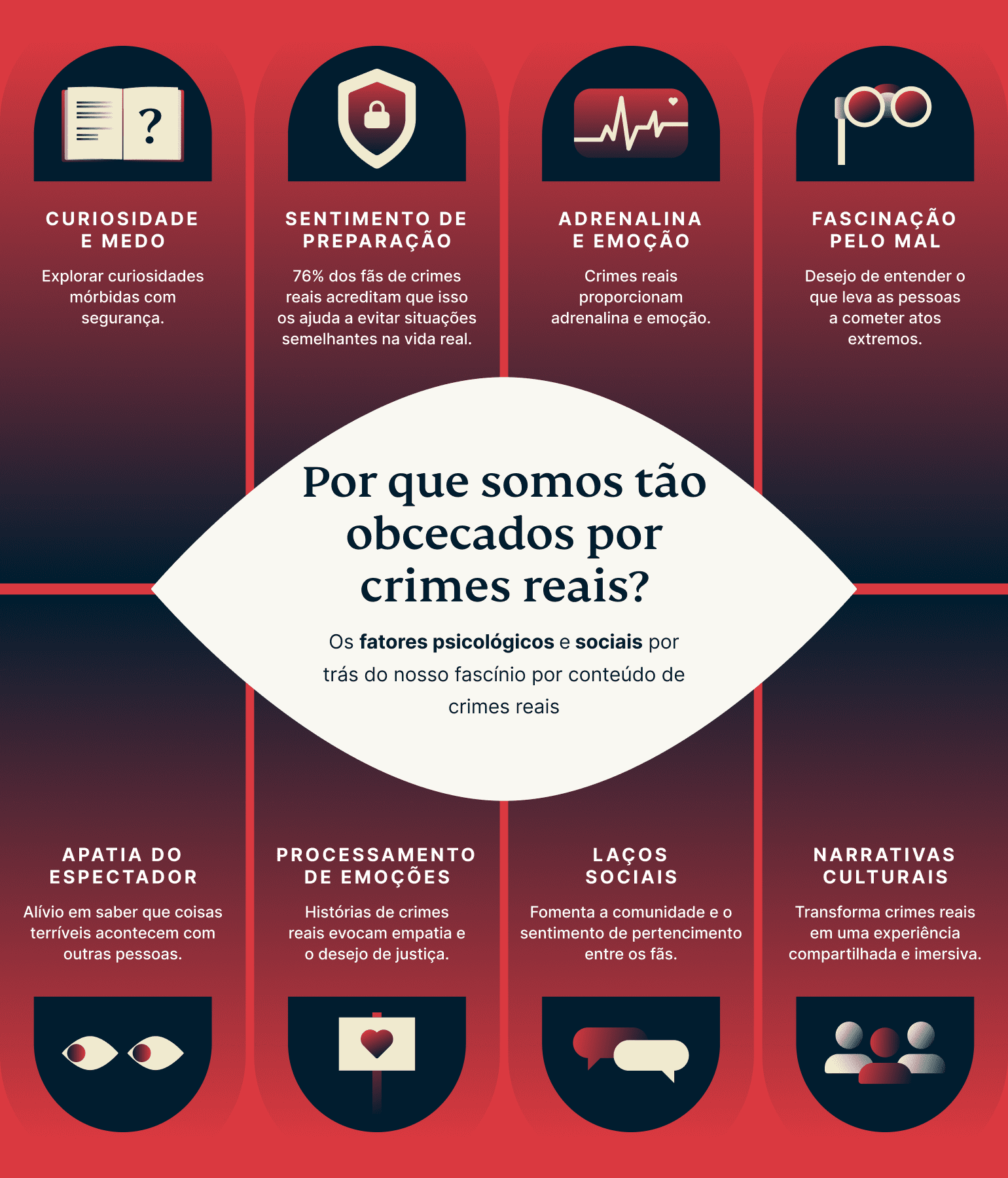 - Fatores psicológicos como curiosidade, controle do medo e busca de emoção alimentam nossa obsessão por crimes reais.