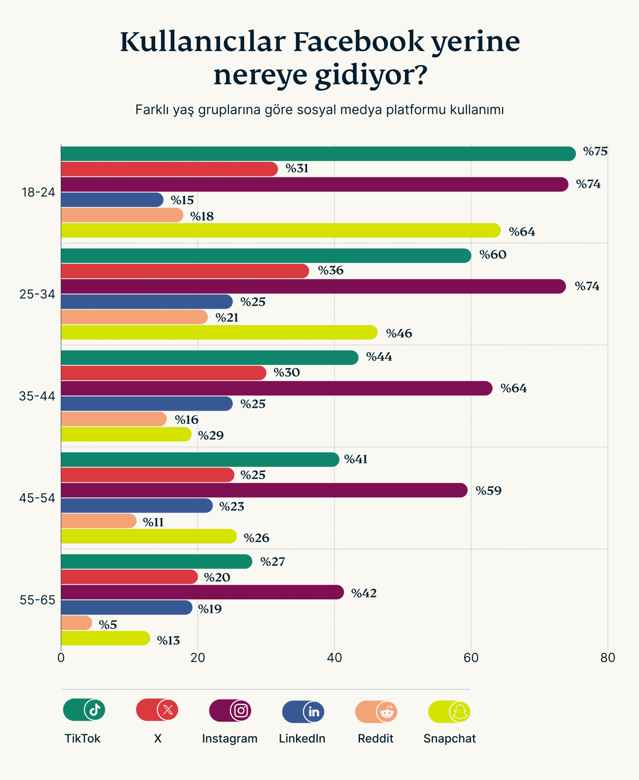 Öte yandan, daha yaşlı kullanıcılar platforma daha sadık kalıyor. 55-65 yaş grubunun %45’i Facebook kullanımının değişmediğini, yalnızca %23’ü ise belirgin bir şekilde azaldığını söylüyor.