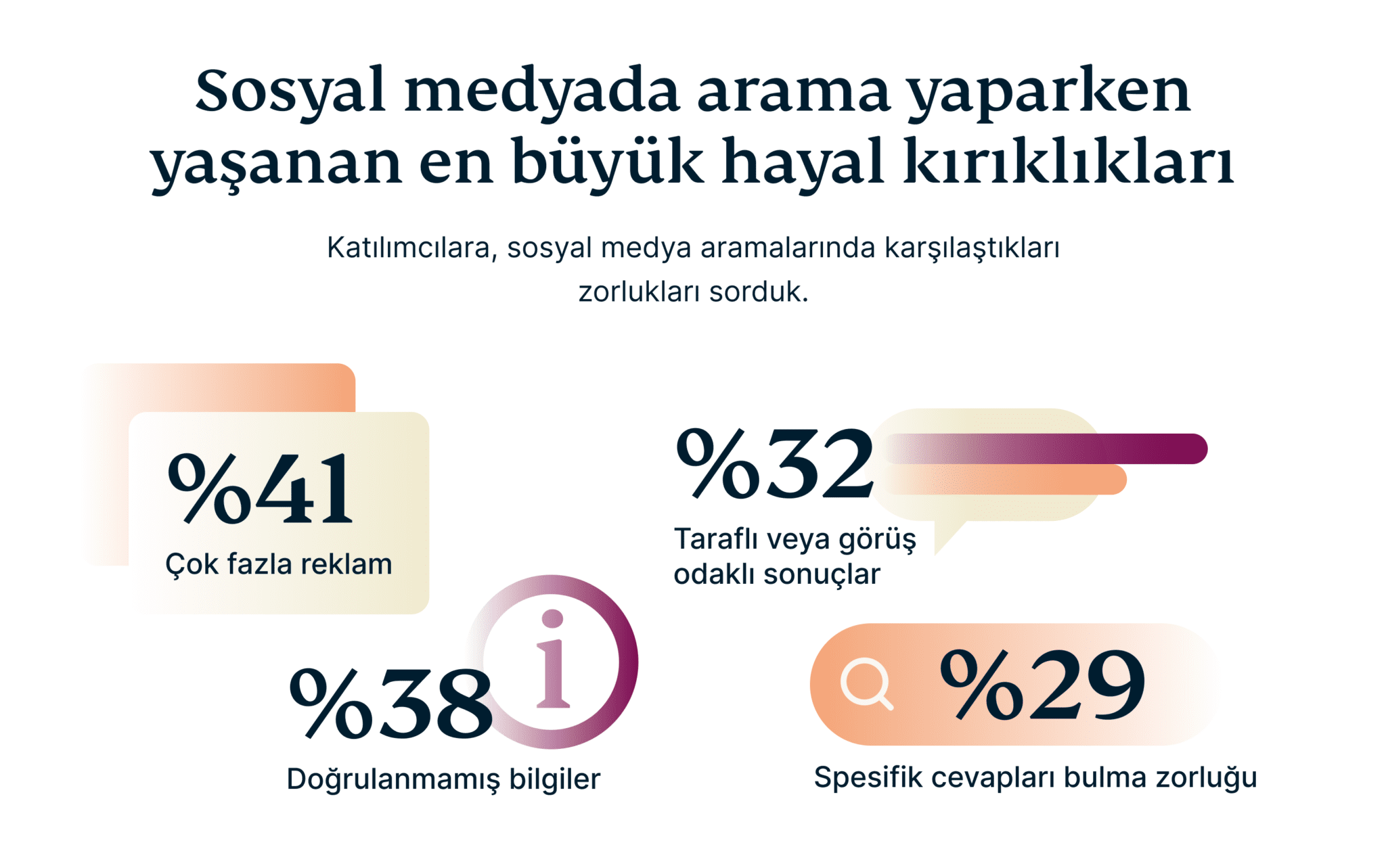 Sosyal medya, dinamik ve ilgi çekici bir şekilde yanıt bulmayı sağlasa da bazı dezavantajları da yok değil. Birçok kullanıcı için müdahaleci reklamlar, doğrulanmamış bilgiler ve taraflı içerikler, bu platformlarda arama yapmayı beklenenden daha zahmetli hale getirebiliyor. Anketimize göre, bu zorluklar bazı kullanıcıların belirli aramalar için hâlâ Google gibi geleneksel araçlara güvenmelerinin nedenlerinden biri.