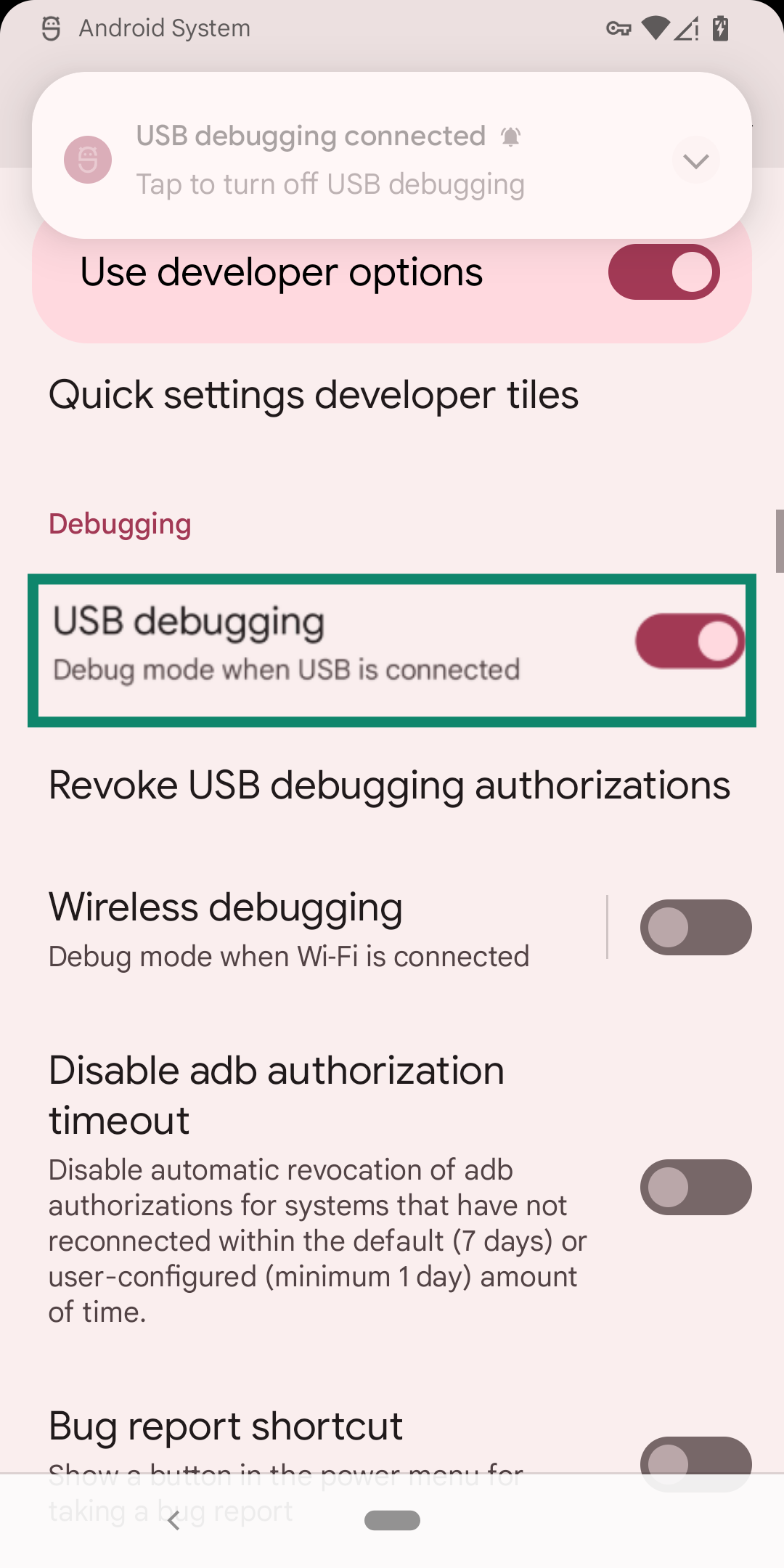 4. Also enable USB debugging, which allows your computer to communicate with the phone.