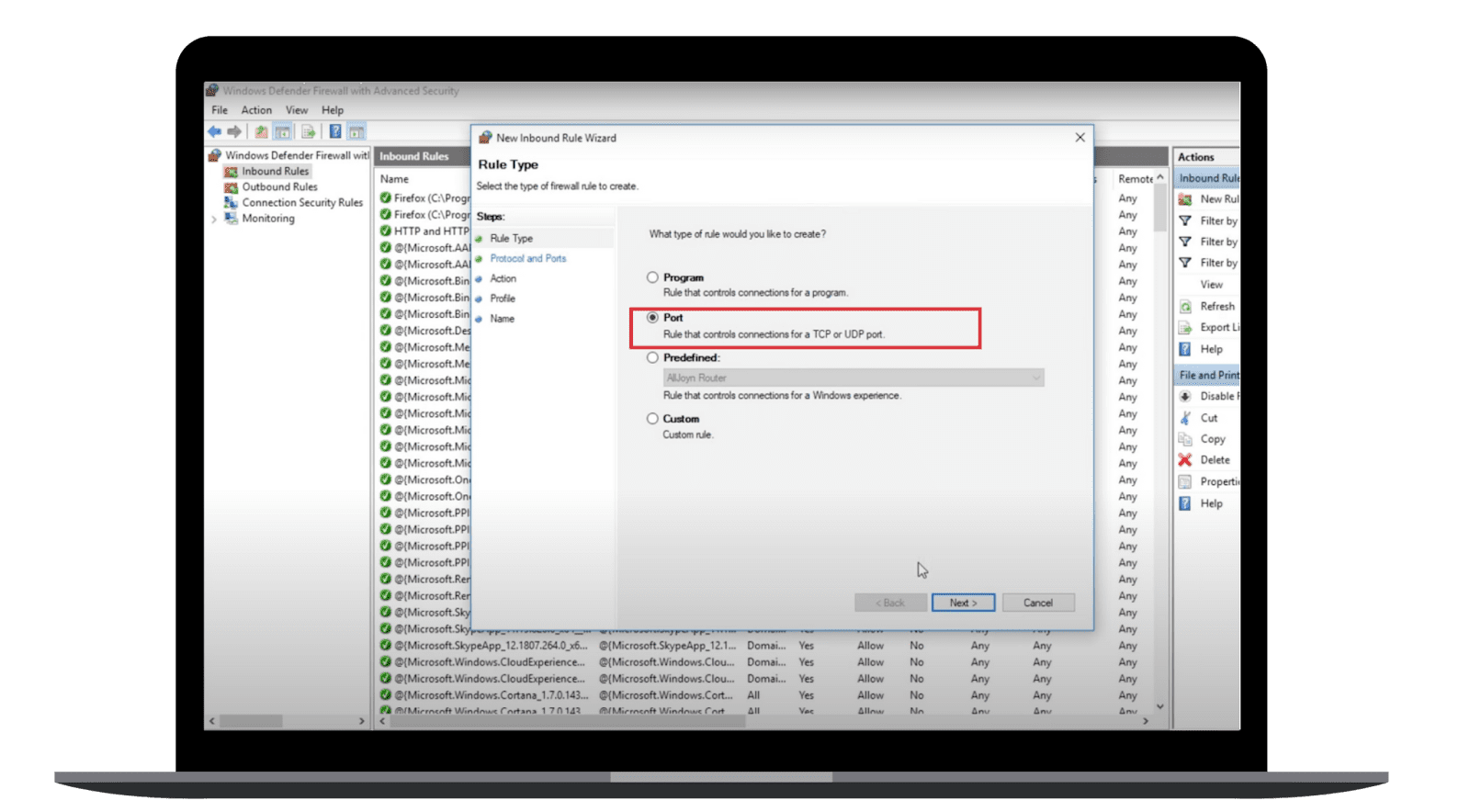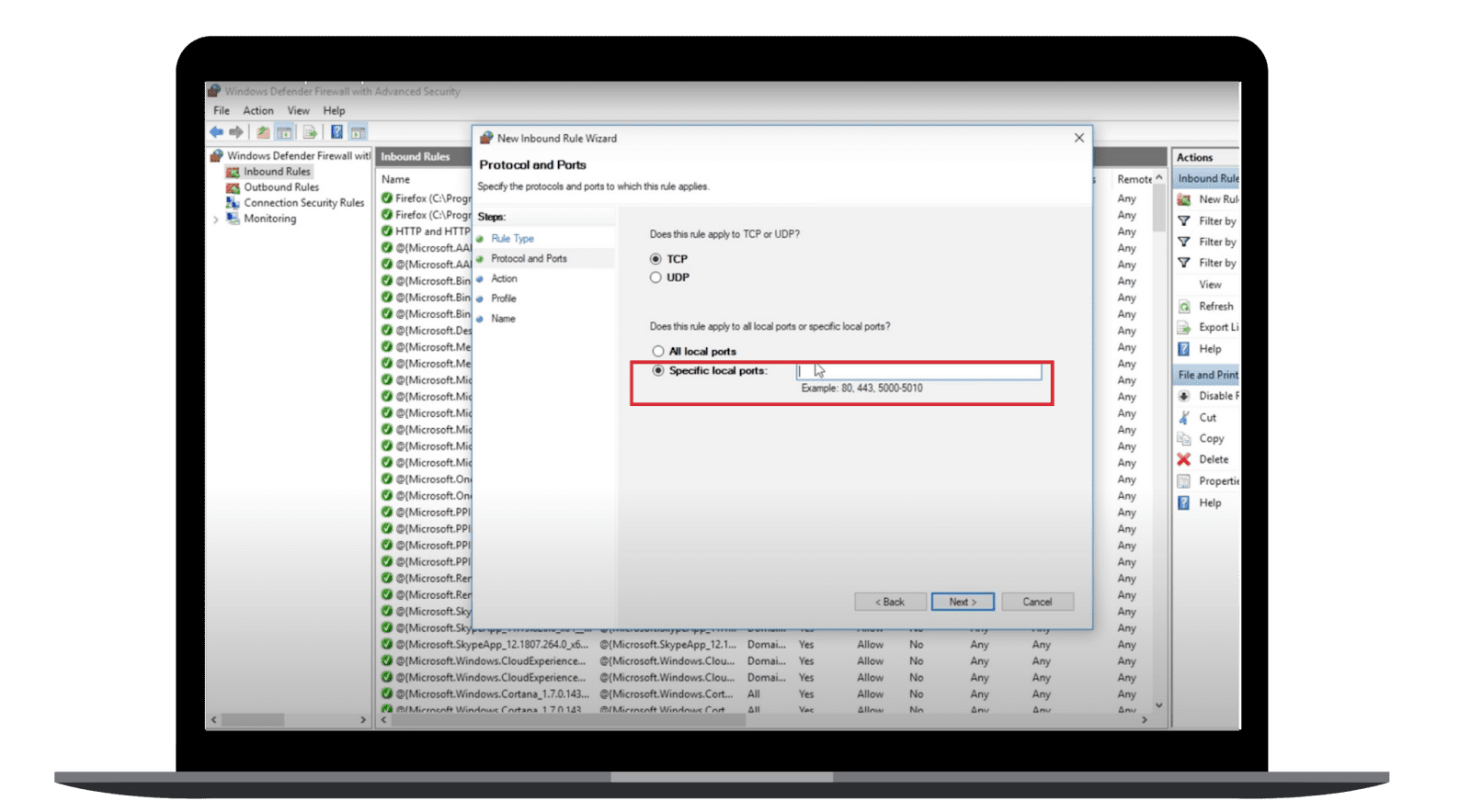 - On Windows: Open Windows Defender Firewall and check the Inbound Rules for HTTPS or Port 443. Add a new rule if needed.