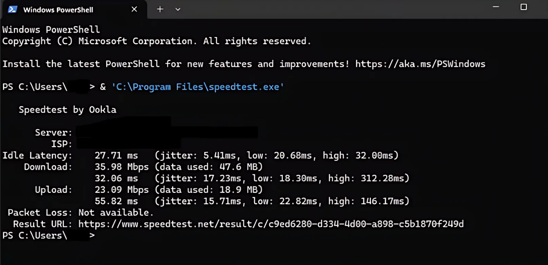 - Run VPN test: Connect to your VPN and run the speedtest command again in the command prompt/PowerShell.