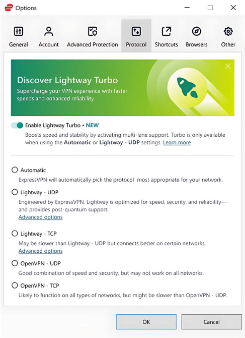 - Switch protocols: Try changing to a protocol known for better speed. For example, if you’re on OpenVPN, experiment with WireGuard or ExpressVPN’s Lightway.