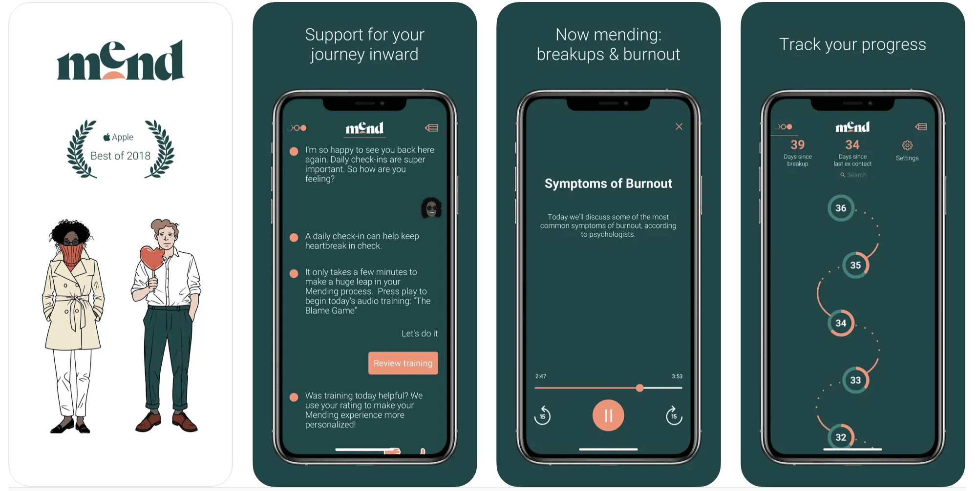 Mend ist online und auf iOS verfügbar und zeichnet sich dadurch aus, dass es sich auf die emotionalen Auswirkungen einer Trennung konzentriert. Durch tägliche Rückfragen, Audio-Trainingssitzungen, die von Experten für psychische Gesundheit und Wellness geleitet werden, und Unterstützung beim Führen von Tagebüchern werden die Nutzer ermutigt, ihr Wohlbefinden in den Vordergrund zu stellen. Die App regt sie dazu an, sich gesunde Gewohnheiten anzueignen, die es dem Einzelnen ermöglichen, seine Emotionen gekonnt zu steuern und zu verarbeiten.
