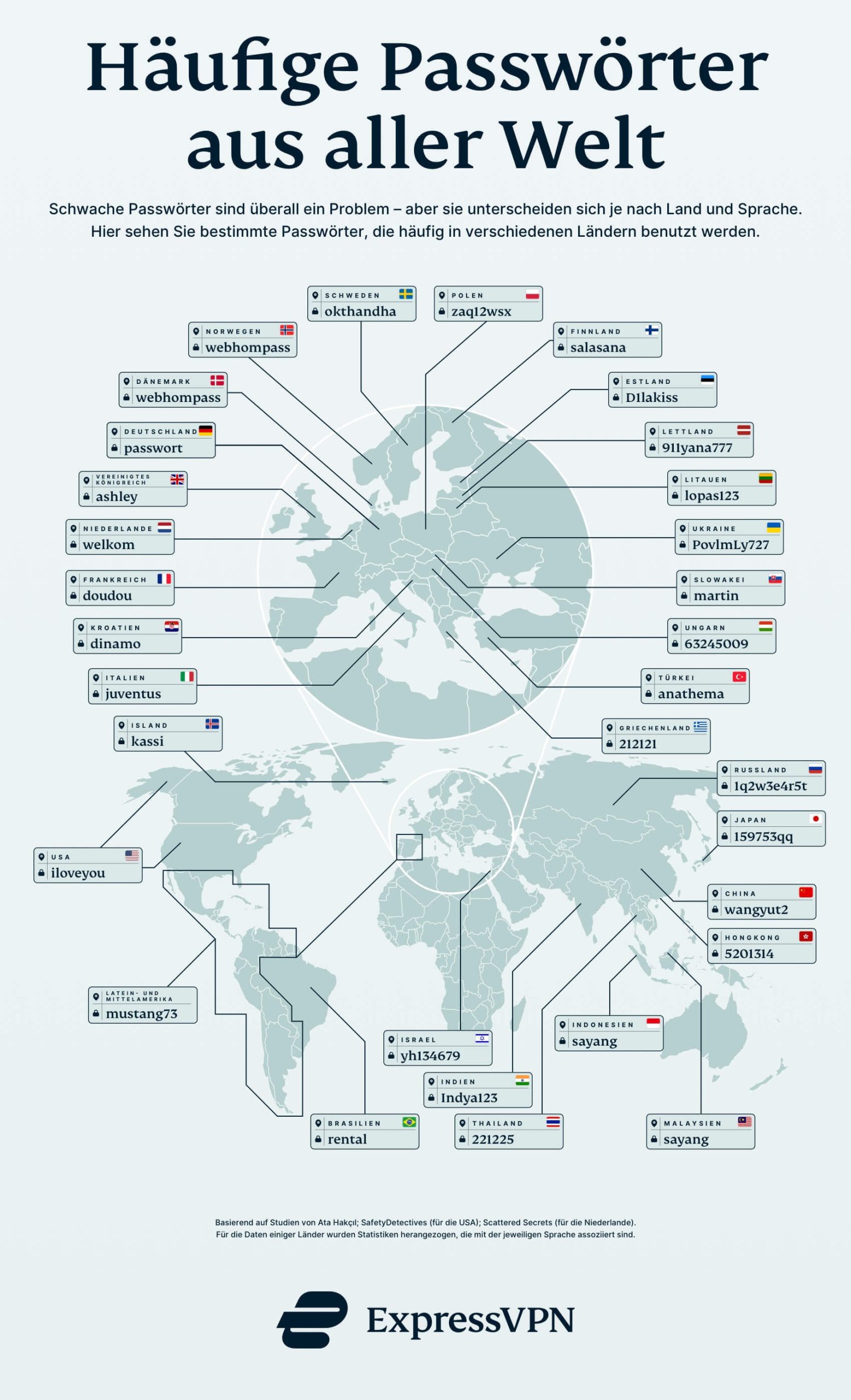 Beachten Sie, dass ein Großteil unserer Daten aus einer von Dritten durchgeführten Studie stammt, die auf Passwort-Leaks basiert und von dem Github-Nutzer Ata Hakçıl zur Verfügung gestellt wurde. Es wird dabei jeweils die Sprache der zugehörigen Webseiten angegeben. Wir haben diese Sprachen verwendet, um auf Länder zu schließen. Es waren nicht für alle Länder/Sprachen Daten verfügbar.