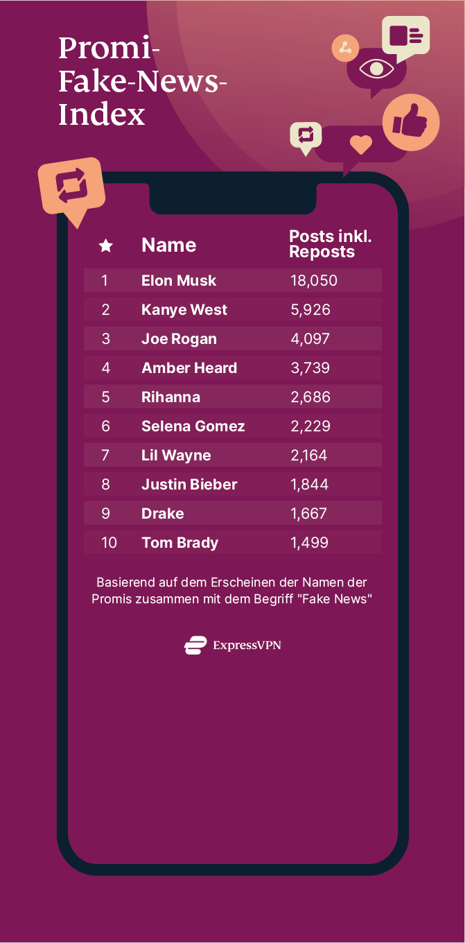 Diese Studie warf einen Blick auf die meistgesuchten Promis im Internet und nutzte Social-Listening-Daten, um herauszufinden, wie oft ihr Name zwischen Januar und Oktober 2022 zusammen mit dem Begriff "Fake News" gepostet wurde. Anschließend haben wir anhand verschiedener Faktoren wie der Anzahl der Posts, der Anzahl der Posts inklusive Reposts, der Impressionen, der Reichweite und des Engagements eine Rangliste der Stars erstellt.
