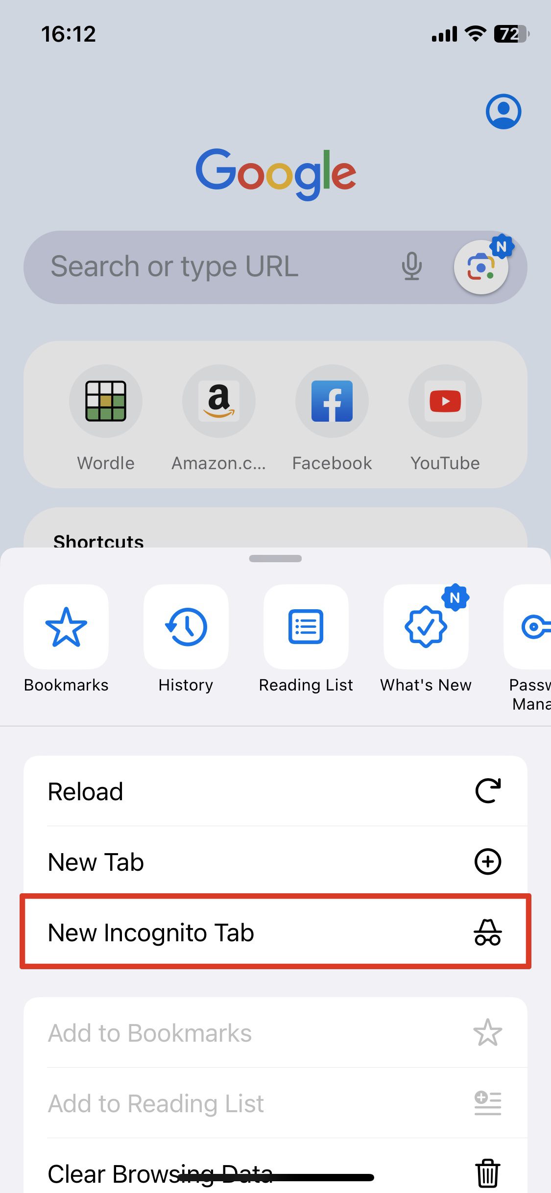 - Toque “Nueva pestaña de incógnito”.