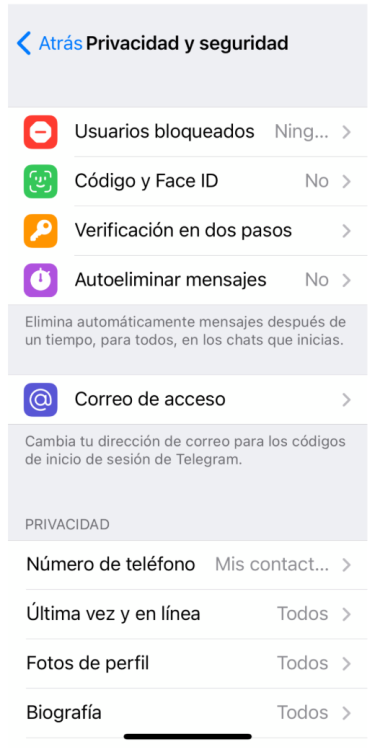 Información importante: estos chats no se almacenan en la nube de Telegram y no se pueden reenviar, pero la persona con la que estás chateando podría sacar capturas de pantalla, así que no hay una garantía de privacidad absoluta.