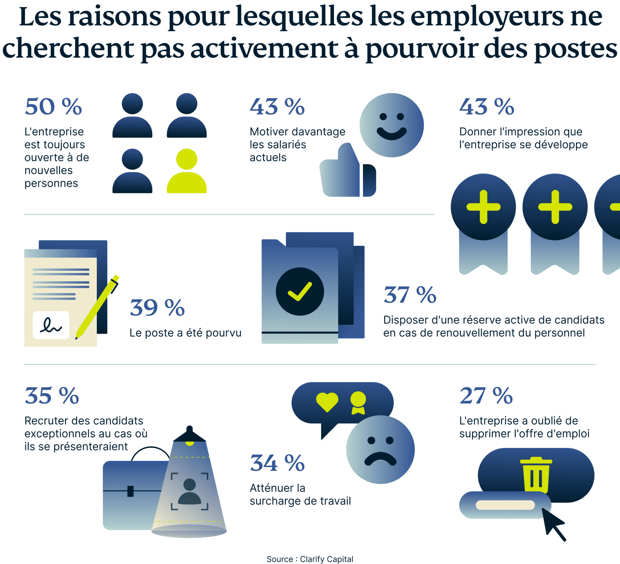 • Selon une étude de Clarify Capital, de nombreux employeurs conservent des annonces d'emplois fantômes au cas où un candidat exceptionnel se présenterait, mais 43 % d'entre eux le font pour donner l'impression que l'entreprise est en pleine croissance.