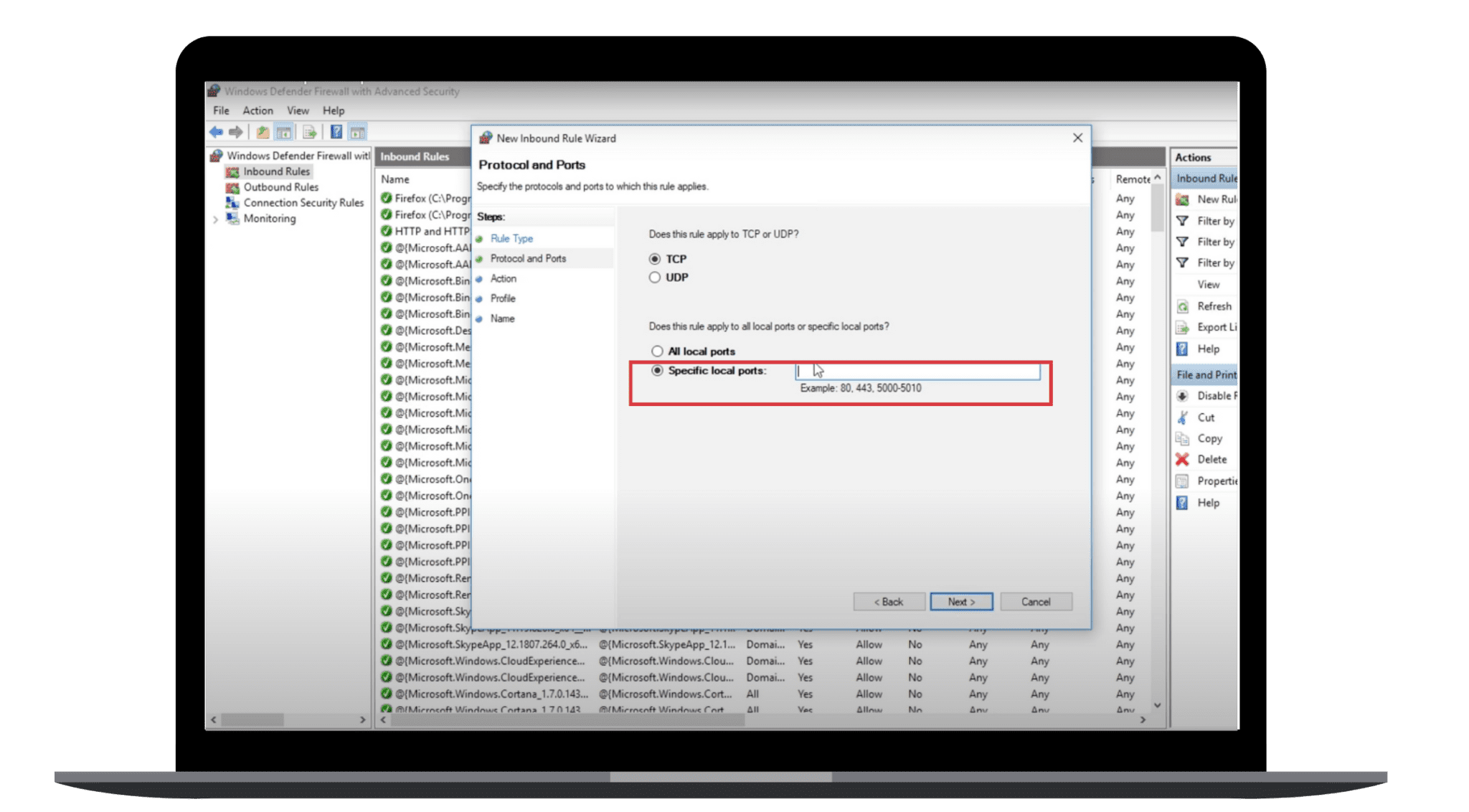 5. Seleziona TCP e Porte locali specifiche. Nella casella Porte locali specifiche, digita 443 e clicca su Avanti.