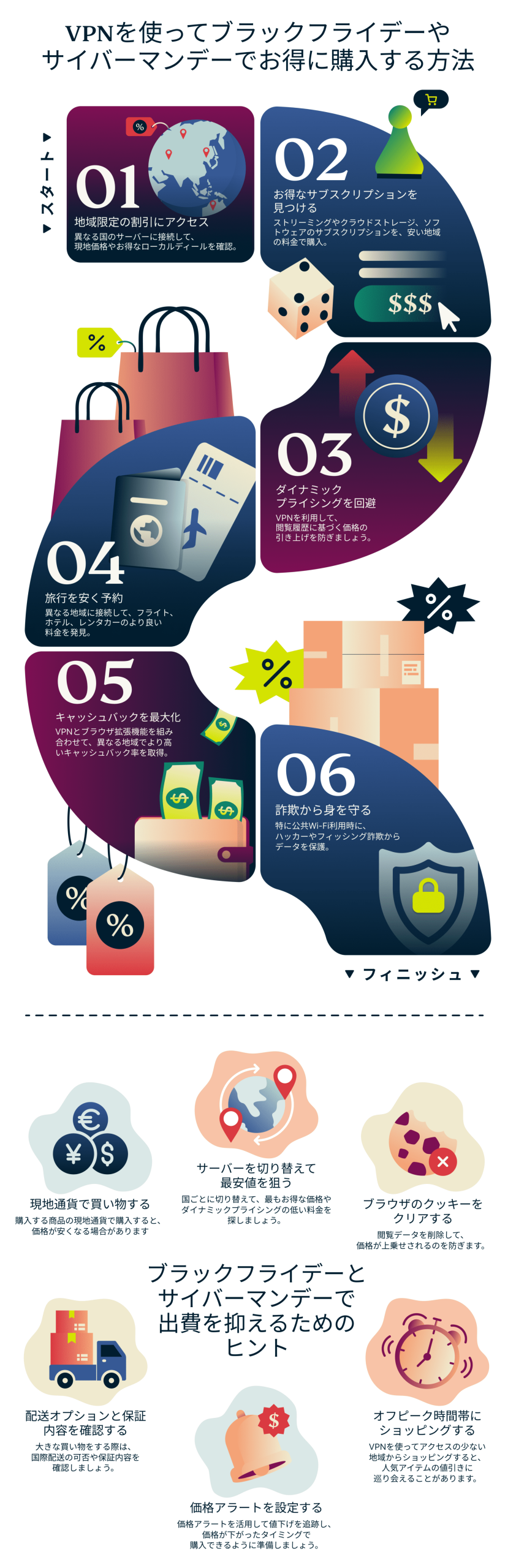 VPNをプライバシーや安全なブラウジングのために使用しているかもしれませんが、実は買い物においても強力なツールになります。バーチャルロケーションを変更することで、テック製品から航空券まで、最高の割引額を見つけることができ、さらに地域による価格変動(ダイナミックプライシング)も回避できます。