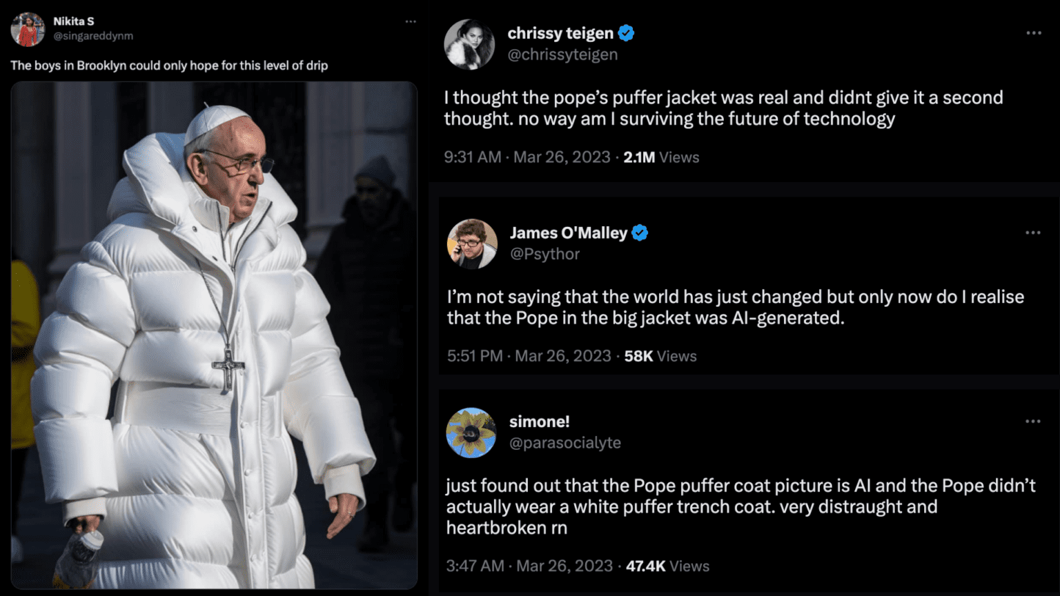 AI画像生成ツールで作成された、白い大きなコートを着たフランシスコ法王の偽写真に、多くのネットユーザーが騙されました。