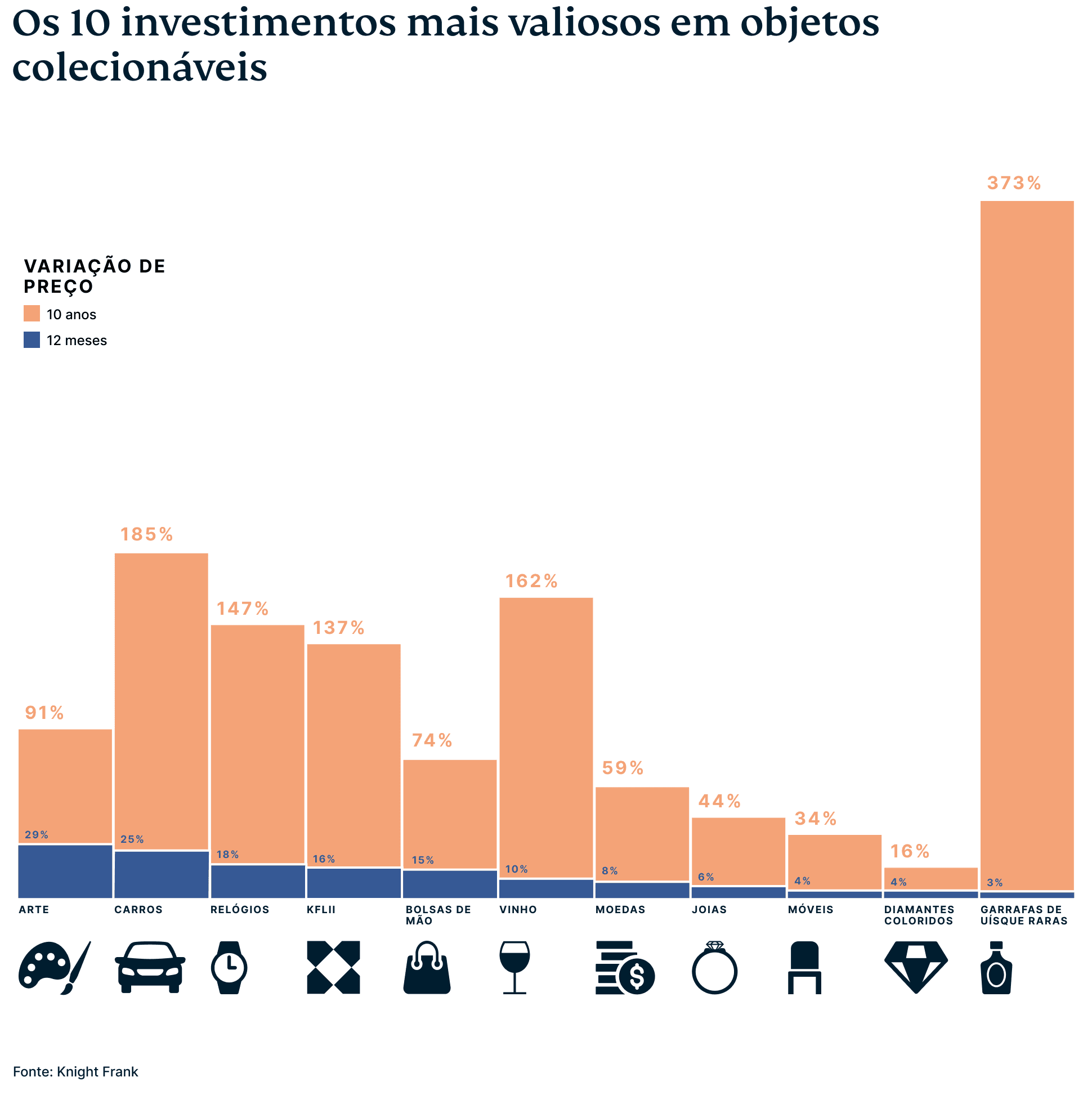 - Investimentos em itens colecionáveis, como uísques raros, arte, artigos de luxo e carros são relativamente estáveis em comparação com o Bitcoin, com potencial para altos retornos.