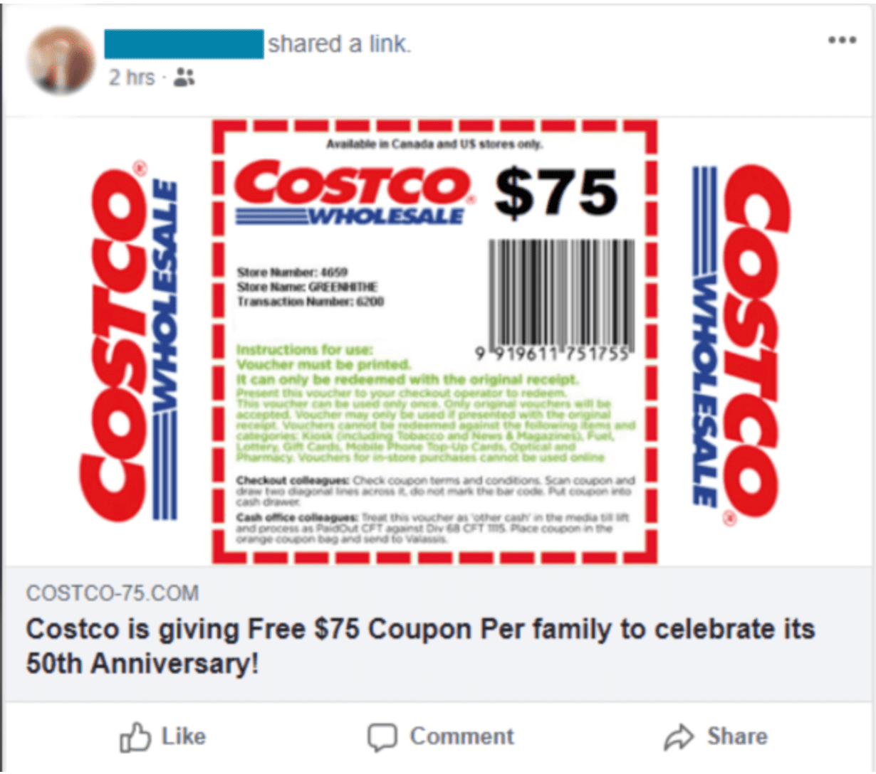 Black Friday ve Cyber Monday sırasında sosyal medya indirimlerle dolup taşar. Bunların bazıları gerçekken, bazıları da ayrıntılı dolandırıcılıkların bir parçası olabilir. Bu sahte reklamlar, kişisel bilgilerinizi ele geçirmek veya sahte ürünler için alışveriş yapmanızı sağlamak amacıyla dolandırıcı web sitelerine yönlendirir. İşte iyi bir örnek: insanların Facebook'ta dolaşan sahte 75 USD Costco kupon teklifiyle kandırıldığı ve bir kuruş bile tasarruf etmeden veri kaybettiği ünlü Costco kupon dolandırıcılığı.